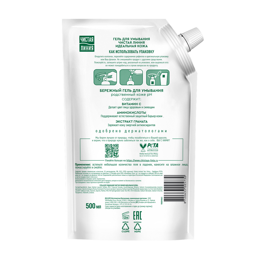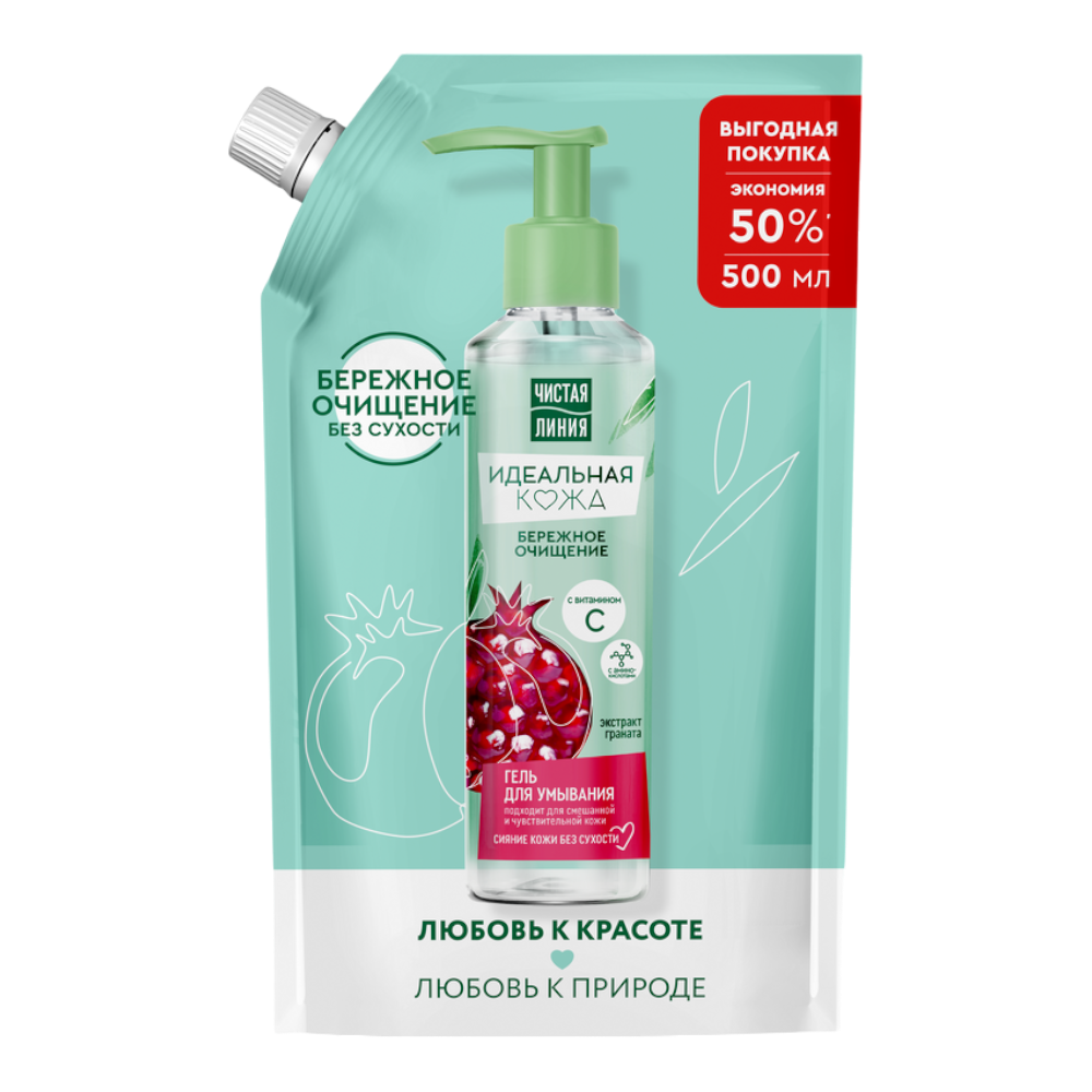Гель для умывания Чистая линия Идеальная кожа Экстракт граната для всех типов кожи, 500 мл