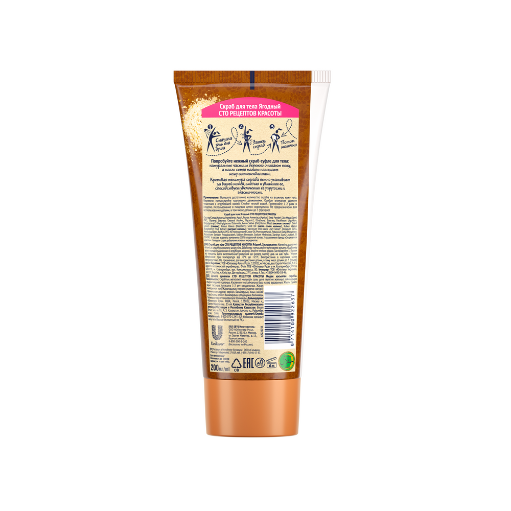 Скраб для тела Сто рецептов красоты Я люблю вкусняшки Малина, сливки и овсяные хлопья, 200 мл